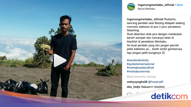 Sebelumnya, kejadian memetik edelweis dilihat detikTravel dari postingan Instagram resmi Taman Nasional Gunung Merbabu, tngunungmerbabu_official pada Rabu (4/7/2018). Dalam caption-nya ada penjelasan tentang pendaki yang memetik edelweis. (msl/aff)