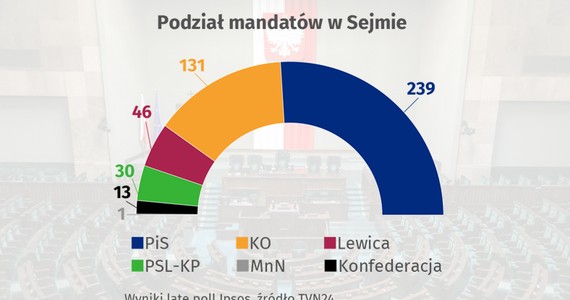 - Według opublikowanych wcześniej wyników late poll PiS zdobył 43,6 proc. głosów; na KO zagłosowało 27,4 proc. wyborców, na Lewicę – 12,4 proc., na PSL-Kukiz’15 - 9,1 proc. oraz na Konfederację 6,4 proc.
