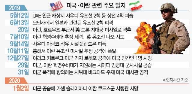 3일(현지시간) 미군의 표적 공습에 이란 군부의 최고 실세 카셈 솔레이마니가 사망하면서 중동 지역에 전운이 감돌고 있다. 미국은 이번 공습이 향후 이란의 공격으로부터 미군을 보호하기 위한 방어적 행동이라며 정당성을 강조했지만 이란은 즉각 보복을 다짐하는 등 크게 반발하고 있기 때문이다.