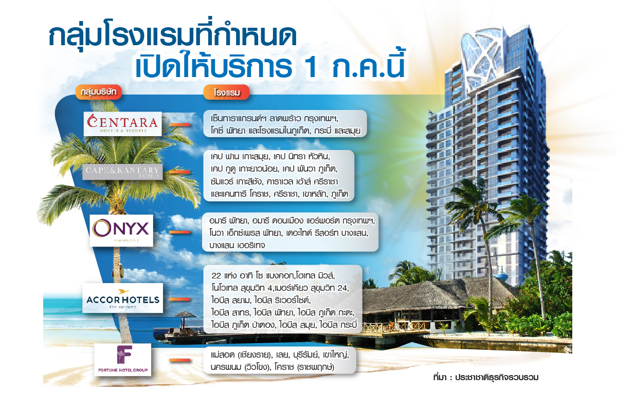 กลุ่มทุนโรงแรมแห่รีสตาร์ตธุรกิจรับงบฯ 2 หมื่นล้าน “เที่ยวปันสุข” วงในเผยเงื่อนไขเอื้อโรงแรมใหญ่ จับตาเมืองท่องเที่ยวหลักกลับมาคึกคัก ขาใหญ่ทั้งไทย-เทศ “เซ็นทารา-AWC-ออนิกซ์-ไมเนอร์-แอคคอร์-เคปฯ-ซีพีแลนด์” ขยับแรง พร้อมเปิดพรึ่บ 1 ก.ค.นี้ ส.โรงแรมมั่นใจปลุกโลว์ซีซั่นฟื้นยาวยันปลายปี