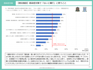 感染症対策に伴う料金意識について訊ねた問いには、「通常と同じ料金であるべき」との回答が44%ともっとも多かったが、37%は「100~500円程度なら上乗せされていても良い」と答えている。合計すると8割以上が通常と同じ料金あるいは多少上乗せし ても許容範囲と答えているのは、感染症対策の徹底を最優先に望む現れと取れる。
