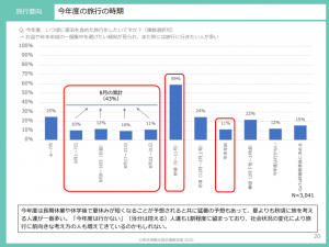 「今年度、いつ頃に宿泊を含めた旅行をしたいですか?」の問いで最も多かったのは、9月~11月の秋ごろで59%。直近の6~7月を挙げた人が25%と秋に続いて多く、旅行に前向きな層も一定数存在することが伺える。6月19日以降に県境をまたいだ移動が緩和されれば、ある程度の人数が宿泊を伴う旅行に出かけそうな勢いが見える。対して、お盆のある8月や年末年始を挙げた人は10~12%と少なめで、お盆や年末年始の一極集中を避けたい傾向が見られるようだ。