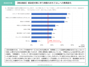「伝統的な旅館のおもてなし対応で、コロナ禍においてなくても良いと思うもの」の問いには、当然のサービスと思われていた7項目全てにおいて、実に3割以上の人が「なくても良い」と答えた。「スタッフ一同でのお迎えやお見送り」「仲居さんによるお茶やおしぼりの提供」「荷物運び」など客との接客機会が多いサービスは必ずしも求められていないばかりか、今後はしないことが却ってコロナ対策としてむしろポジティブに捉えられるかもしれない。