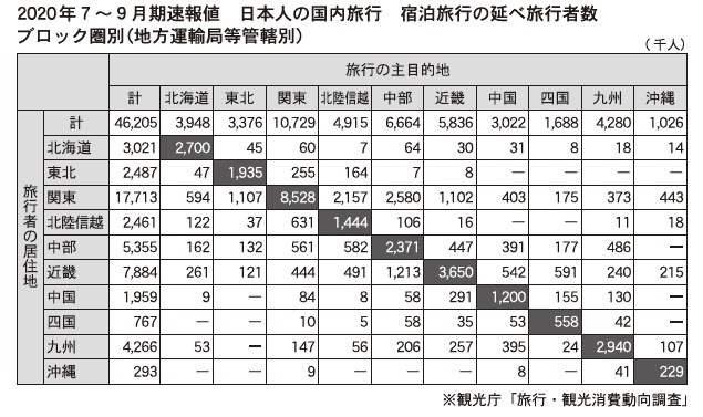 日本人の国内旅行は、7~9月期の延べ宿泊旅行者数が前年同期比51.4%減の4620万人だった。宿泊旅行の需要が前年の半分程度となり、例年とは旅行環境が大きく異なるが、居住地と同じ地方ブロック圏内への宿泊旅行の割合は、地方運輸局などの管轄ベースの10地方ブロック圏全てで前年同期、前々年同期を大幅に上回った。