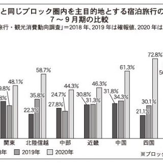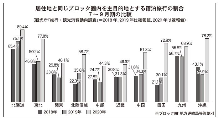 20年7~9月期における居住地と同じ地方ブロック圏内への宿泊旅行の割合(カッコ内は前年同期比)は、北海道89.4%(14.3ポイント増)▽東北77.8%(27.6ポイント増)▽関東48.1%(18.3ポイント増)▽北陸信越58.7%(22.9ポイント増)▽中部44.3%(19.6ポイント増)▽近畿46.3%(15.0ポイント増)▽中国61.3%(27.0ポイント増)▽四国72.8%(42.7ポイント増)▽九州68.9%(13.1ポイント増)▽沖縄78.2%(44.3ポイント増)。